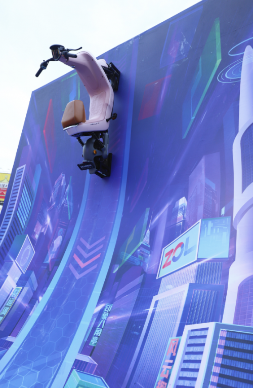 全场造型最独特的展区就在哈啰电动车这里,这是赛博朋克城市中的“折叠五一路”,三维绘画结合超大展示空间里,一条大道贯穿城市,通天达地,大道上端一辆哈啰电动车B70 Pro冲天而起,大道下端一辆哈啰电动车从道路上飞驰而出。置身其中,仿佛沉浸于未来世界,其中之妙处不言而喻。奇妙科幻的创意布置,使电动车呼之欲出,电动车玩出了“滑板、飞碟”的视觉震撼,这也让众多市民和网红在此打卡留念。
